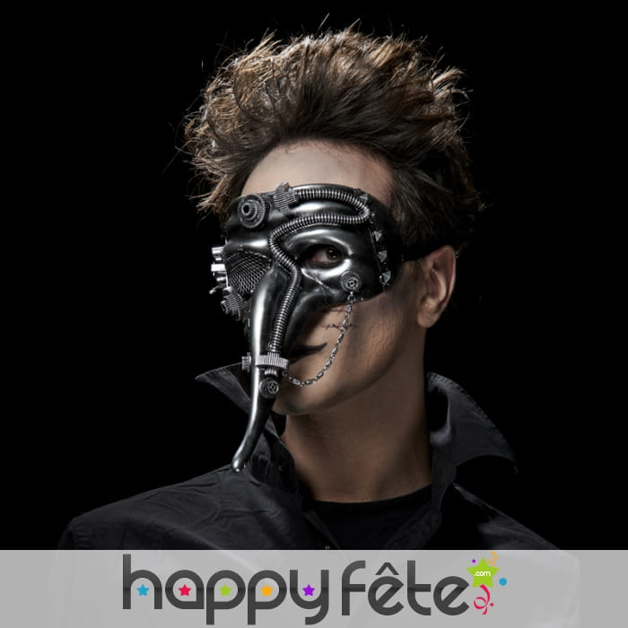 Si vous aurez à prendre part à une fête à thème ou déguisée, ou tout simplement pour halloween, nous vous proposons comme accessoire ce masque vénitien futuriste effet métal. Composé uniquement de PVC imitation métal, il reste disponible sur notre site. Ce masque au nez pointu et allongé vers le bas, a été conçu aussi bien pour les femmes que les hommes. Il présente des couleurs grises argentées, avec des nuances de noir.