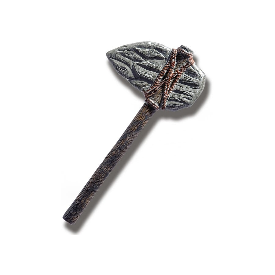 Elle est en plastique mais le haut imite parfaitement une pierre taillée attachée par une ficelle à un bâton en bois.