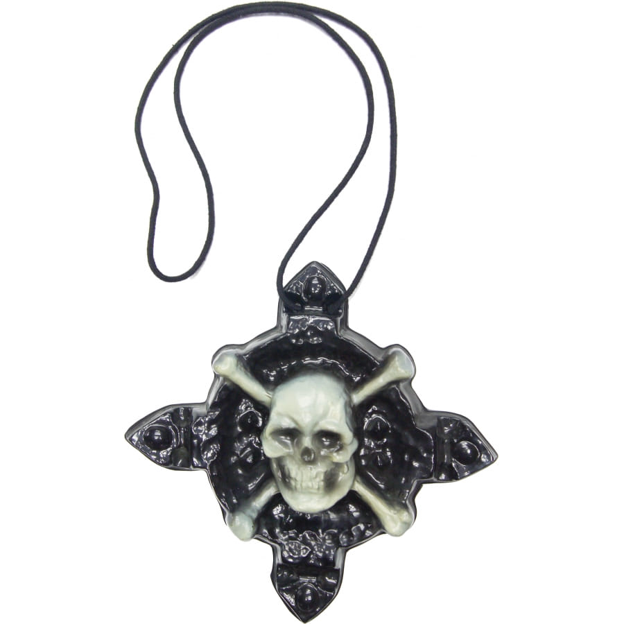 Ce médaillon vous sera utile si vous vous déguiser en pirate ou si vous partez a une soirée sous le thème horreur. Le médaillon fait onze centimètre, en plastique de couleur noir il a une tête de mort dessus de couleur blanc.