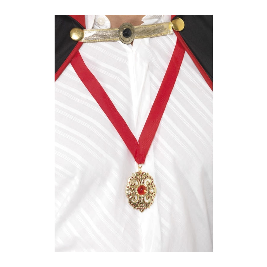 Médaillon de vampire de couleur dorée et rouge, attachée à un cordon rouge, pour homme ou adolescent. Ajoutez cet accessoire à votre déguisement de vampire pour lui donner plus d'élégance et de classe.