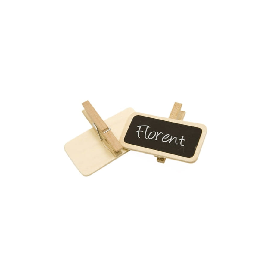 Au lieu d'imprimer les noms des invités sur du papier, optez pour des ardoises sur lesquelles vous pourrez tout inscrire par vous-même. Les mini ardoises en bois naturel sur pince sont suggérées pour toutes les grandes occasions. L'article comprend 12 petites ardoises rectangulaires, de couleur beige, chacune équipée d'une pince à linge en bois à l'arrière.