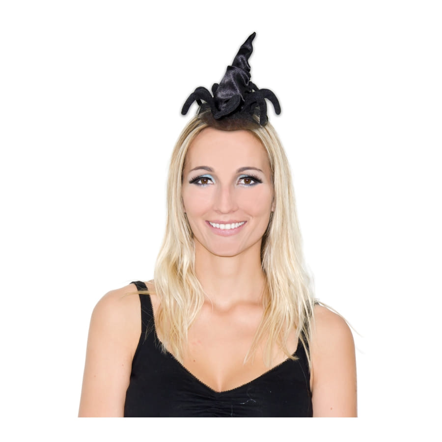 Mini-chapeau de sorcière de couleur noire, pour femme. Ce petit chapeau pointu est en forme d'araignée poilue, de quoi parfaitement vous mettre dans une ambiance d'Halloween et d'adopter un déguisement effrayant.