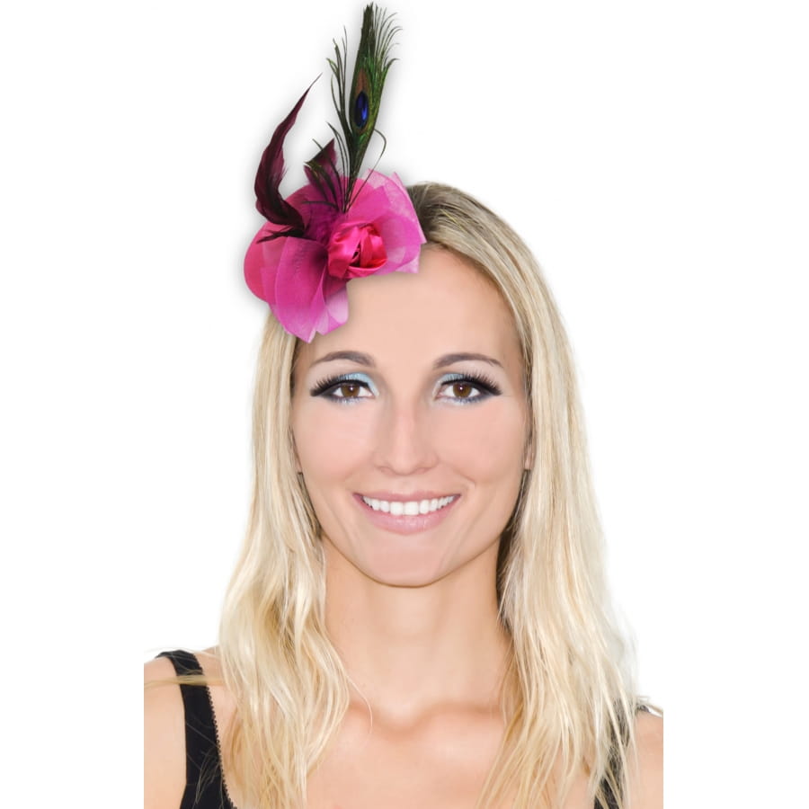 Mini-chapeau de couleur fuschia pour femme. Il en existe 2 modèles dont un avec plume et fleur roses et un autre avec un mini haut-de-forme rose également. Au moment de la commande, vous ne pourrez choisir ni le modèle ni la couleur du chapeau et recevrez un des modèles possibles. Dépendant du thème de votre soirée, cet accessoire ajoutera une touche glamour.