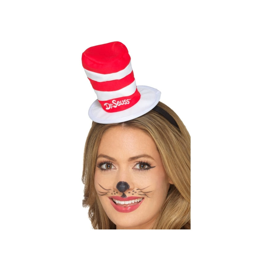 Il est temps de s'amuser ! Avec ce mini chapeau du chat chapeauté, vous allez faire plaisir aux petits enfants. Ils reconnaîtront en vous leur personnage préféré. Ce petit couvre-chef est an fait un mini haut de forme de couleur rouge et blanche fixé sur un serre-tête. Vous remarquerez l'inscription "Dr Seuss" sur le devant.