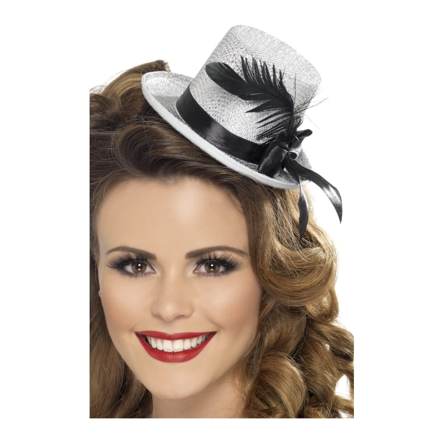 Un mini chapeau pour le carnaval , complètera votre déguisement pour une fête ayant pour thème sexy et charme. Vous serez très belle avec ce chapeau qui est de couleur gris avec un ruban noir sur la base et une plume noire sur le coté.