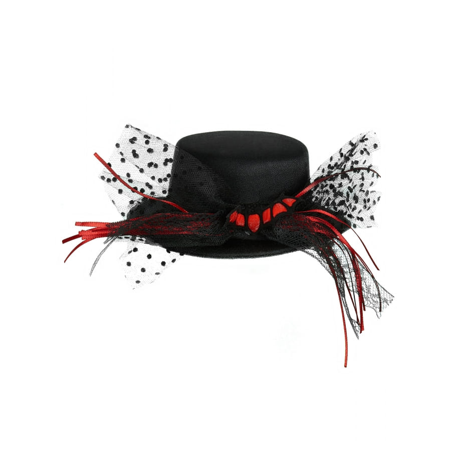 Maintenu sur vos cheveux par des pinces, cet accessoire est ornementé par un volant blanc à pois noirs et des tulles rouges qui mettent en avant une petite araignée.