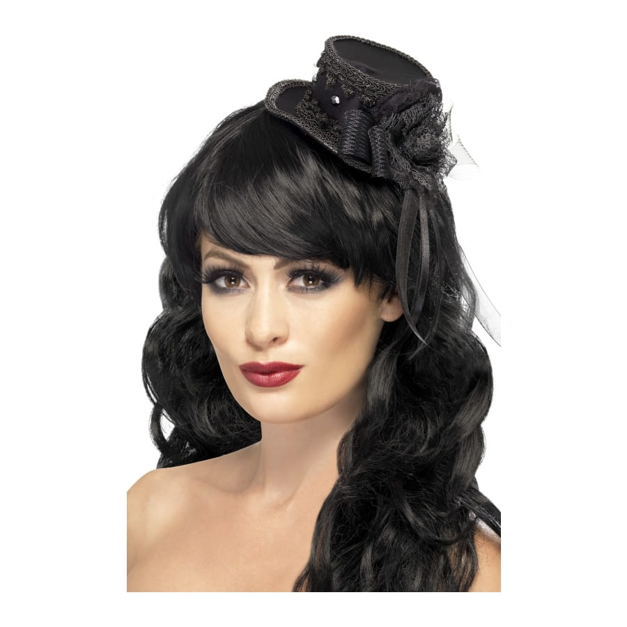 Mesdames vous pourrez porter ce chapeau pour compléter votre déguisement. Il vous rendra encore plus belle et élégante. Vous pourrez le porter pour une soirée gothique. Ce mini chapeau est noir avec de la dentelle dessus qui forme une fleur et il y a aussi des rubans.