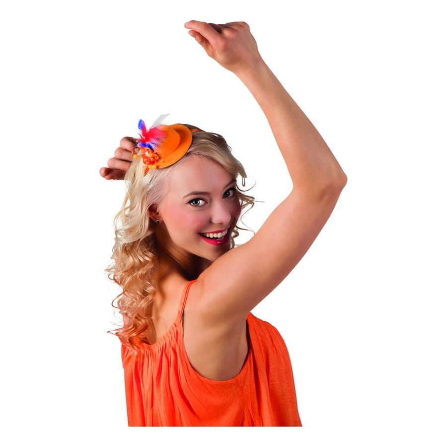 Le mini chapeau orange avec plumettes tricolores est un accessoire pour adulte.
