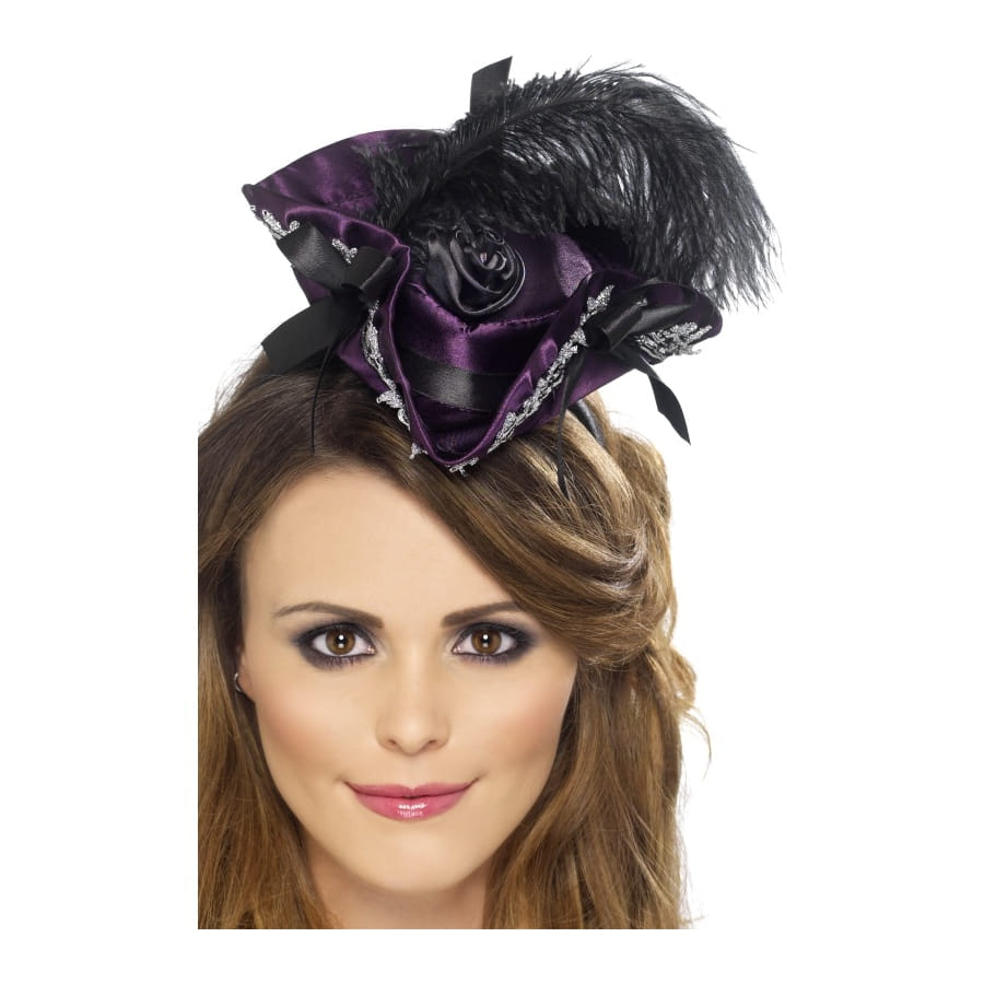 Un mini chapeau de pirate vous pourrez le porter pour compléter votre déguisement de pirate. Il est de couleur noir et violet avec des motifs blanches, il a une plume noir sur le coté. Vous pourrez porter ce joli chapeau a plusieurs occasion.