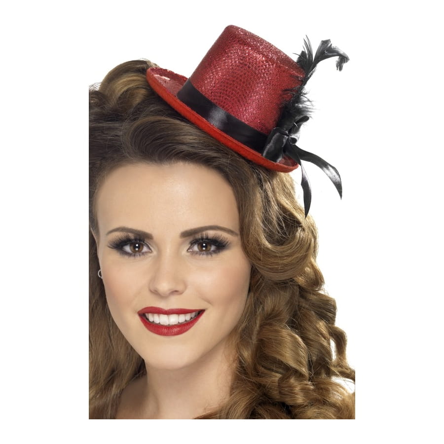 Mini-chapeau de couleur rouge pour femme. Cet accessoire est agrémenté de paillettes, ainsi que d'un ruban avec noeud et de plumes noires. Il sera idéal pour un déguisement de danseuse de cabaret.