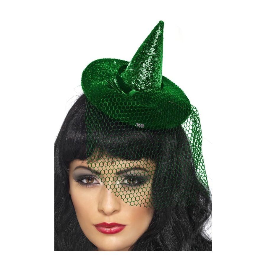 Mini-chapeau de sorcière de couleur verte pour femme. Ce chapeau pointu est orné de paillettes et d'un filet assorti. Il vous apportera une touche très glamour à votre déguisement de sorcière à l'occasion d'Halloween.