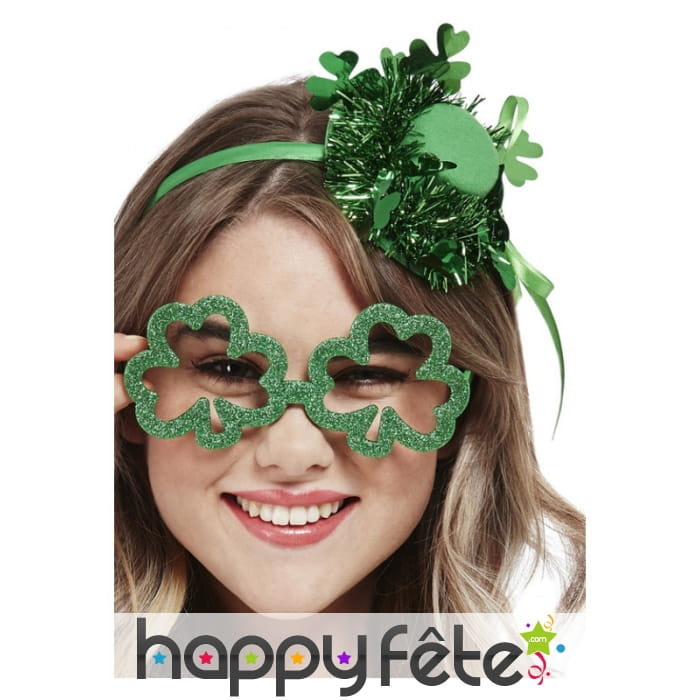 Monté sur un serre-tête vert, ce petit haut de forme est décoré de guirlandes vert foncé scintillantes accompagnées de plusieurs trèfles et de rubans.