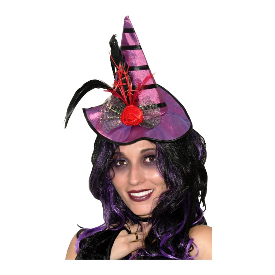 Serre-tête monté d'un mini-chapeau de sorcière de couleur noire et violette, pour femme. Le chapeau est orné de plumes noires et rouges ainsi que d'une fleur rouge. Peu ordinaire, ce chapeau ajoutera une touche gaie à votre déguisement de sorcière.
