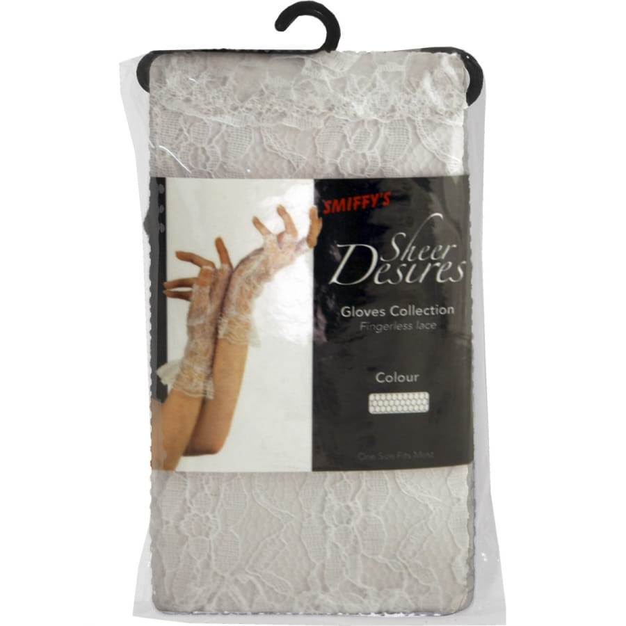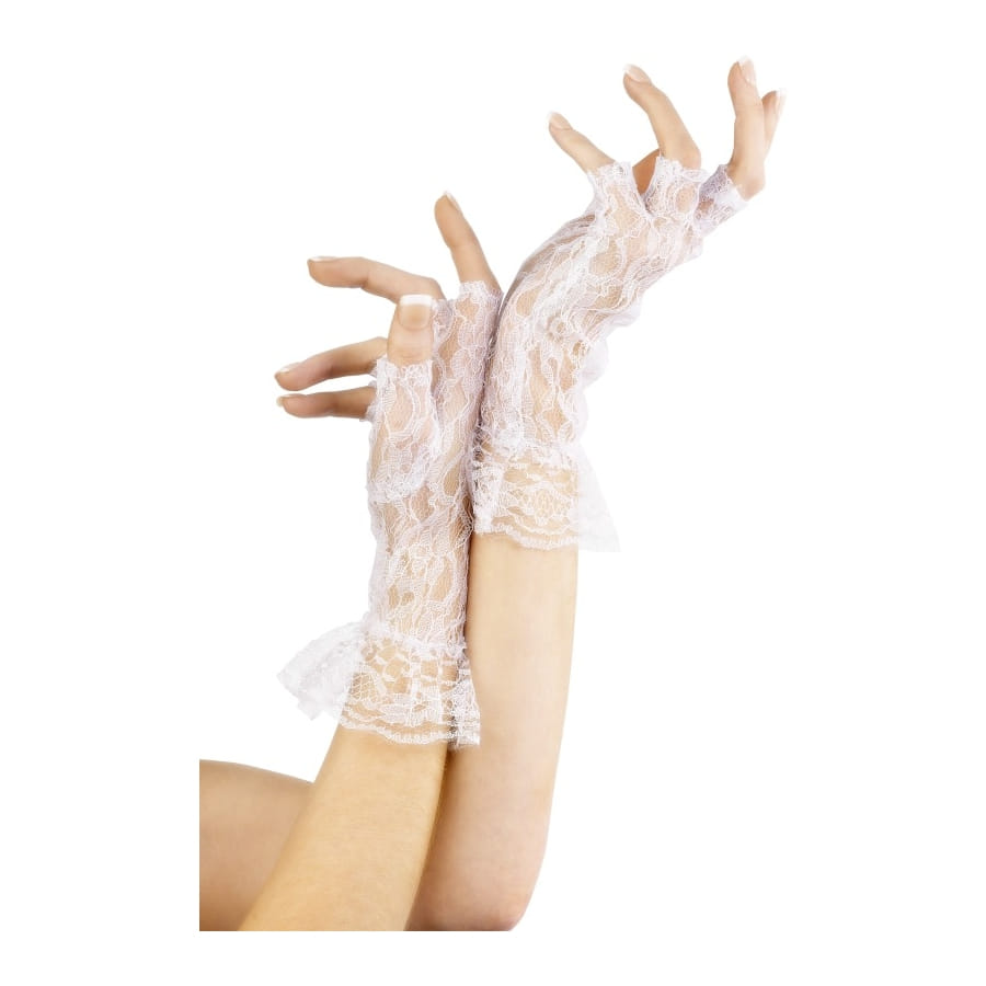 Paire de mitaines en dentelles de couleur blanche pour femme. Ces mitaines transparentes ne recouvrent pas le bout des doigts. Elles sont parfaites pour une tenue punk, ou pour compléter un déguisement de mariée zombie pour Halloween.