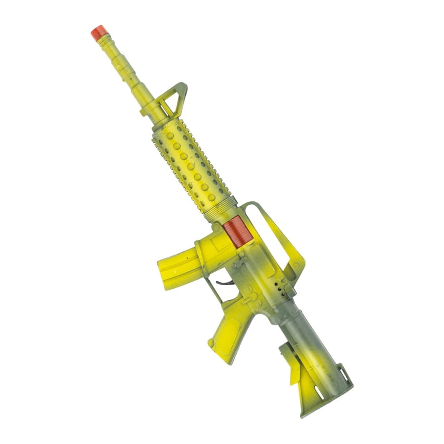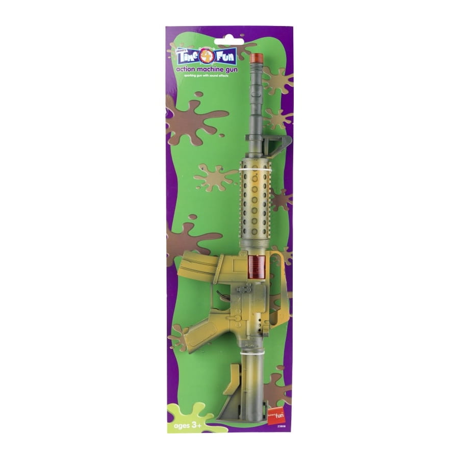 Mitraillette de couleur jaune, marron et verte à effets sonores. Ce jouet pour enfant mesure 44 centimètres de long. Avec son aspect camouflage de guerre, ce fusil sera parfait pour un déguisement de guerrier ou de soldat.