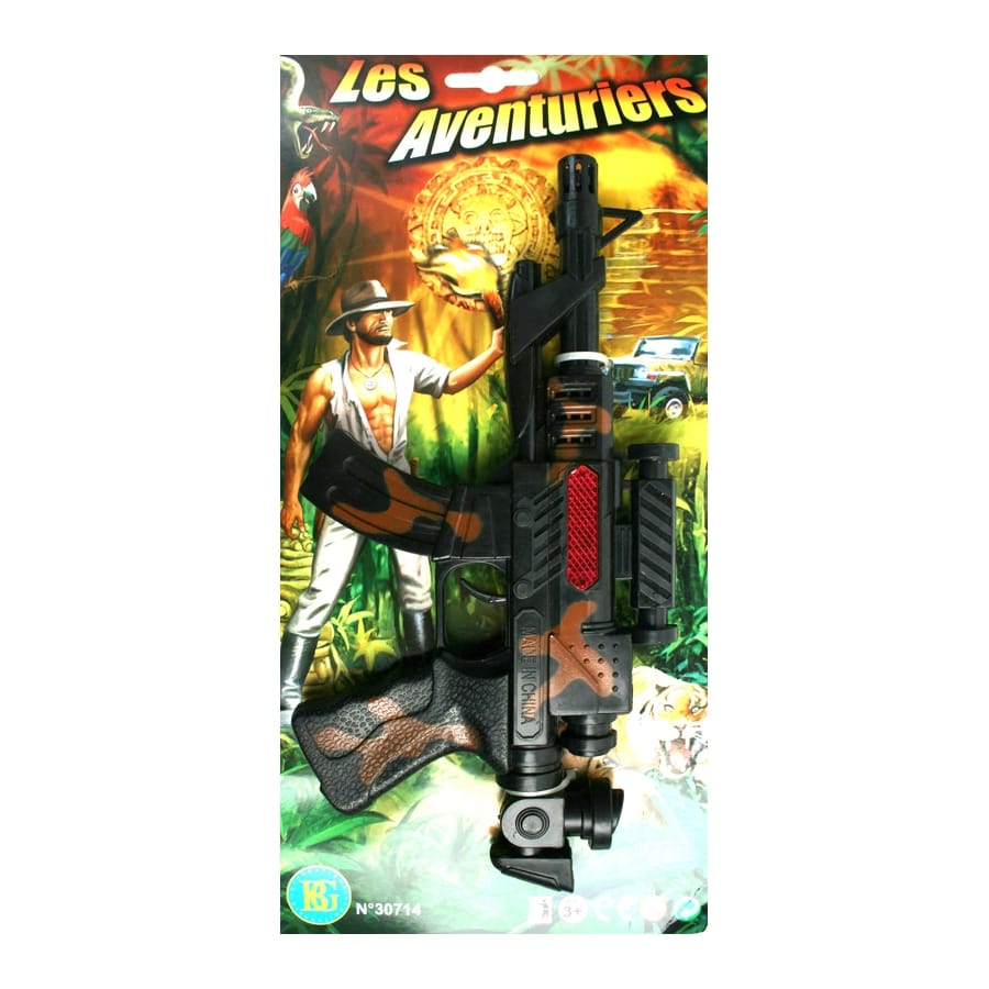 Votre petit guerrier a quand même besoin d'armes pour partir à l'aventure ! N'hésitez-pas, avec celle là, il ne s’ennuiera pas longtemps. Cette mitraillette avec étincelles lui sera très pratique pendant ses missions de sauvetage. De couleur noire ornée d'un camouflage militaire, elle est idéale pour nos petits durs ! Ils pourront se dissimuler au fin fond de la jungle imaginaire sans que les méchants ne s'en aperçoivent !