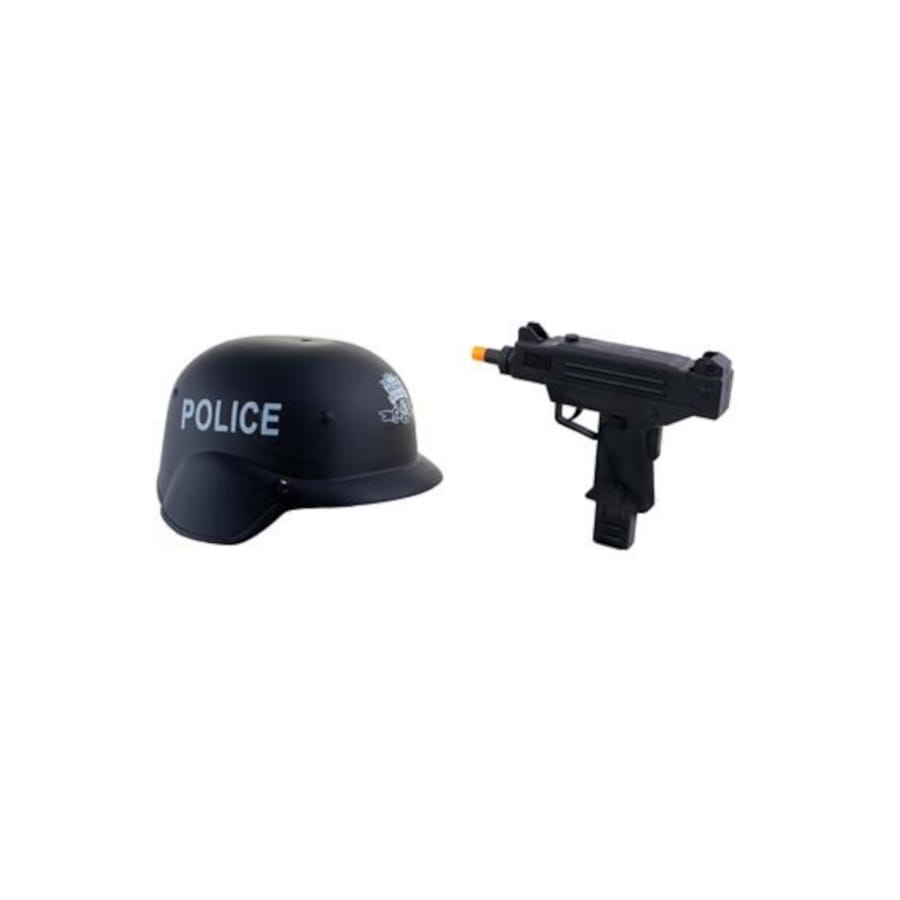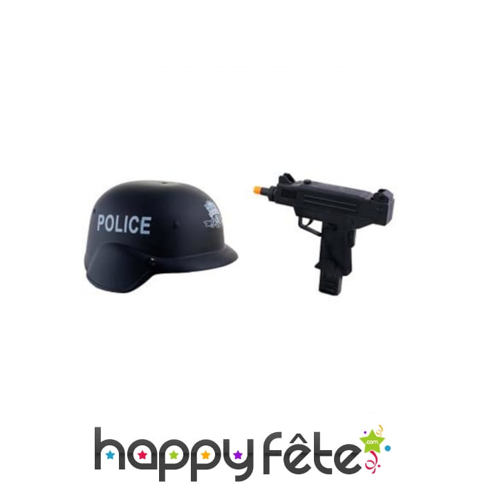 Equipez votre enfant de cet ensemble mitraillette et casque de policier en plastique.