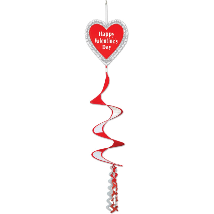 Mobile en forme de coeur rouge avec bordure blanche imprimé de "Happy Valentine's Day". La taille de cet accessoire est de 75 centimètres. Parfait pour créer une ambiance romantique, mettez-le en marche et il fera le reste du travail!