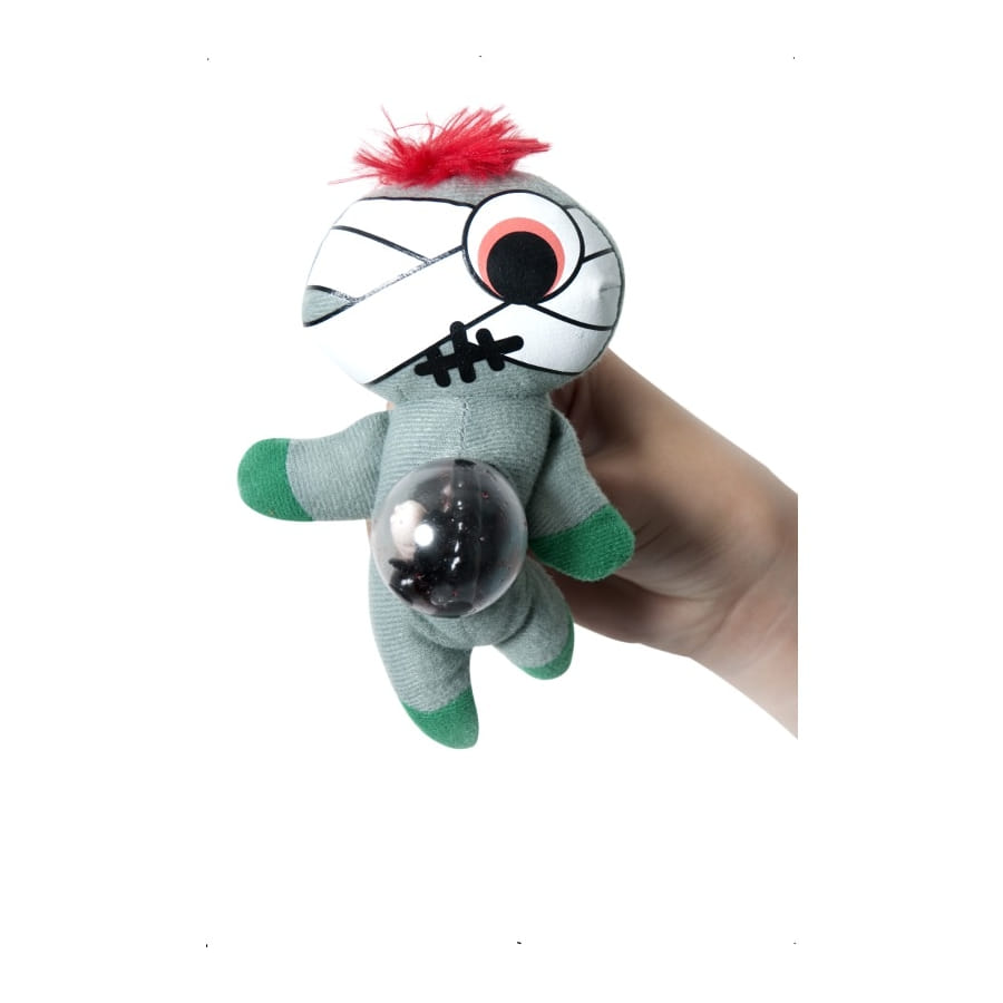 Poupée souple et maléable à presser, en forme de momie blanche. La poupée est de couleur blanche, grise, rouge et verte et convient aux homme, femme, adolescent, adolescente, garçon ou fille. Cette poupée peut servir d'anti-stress ou de décoration pour Halloween.