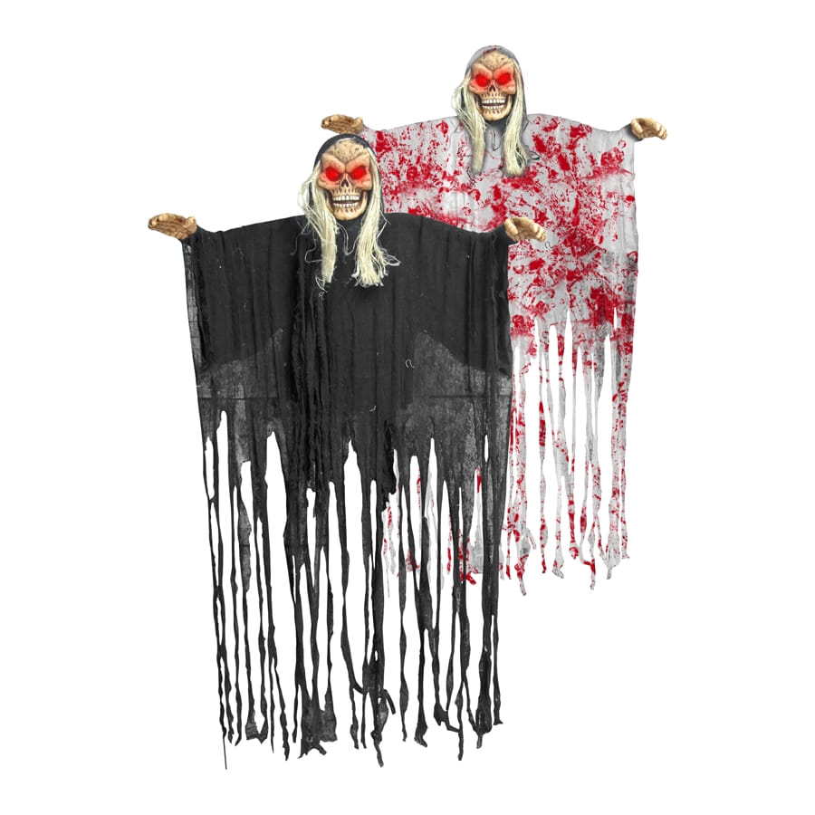 Suspension en forme de monstre de 170 centimètres de haut. Cette décoration est constituée d'un squelette agrémenté de cheveux et habillé de tissus blancs et noirs qui émet des cris effrayants et dont les yeux clignotent en s'activant au moindre bruit. Ce modèle de suspension est livré avec piles, mais en ce qui concerne le modèle, vous recevrez un de ceux présentés.