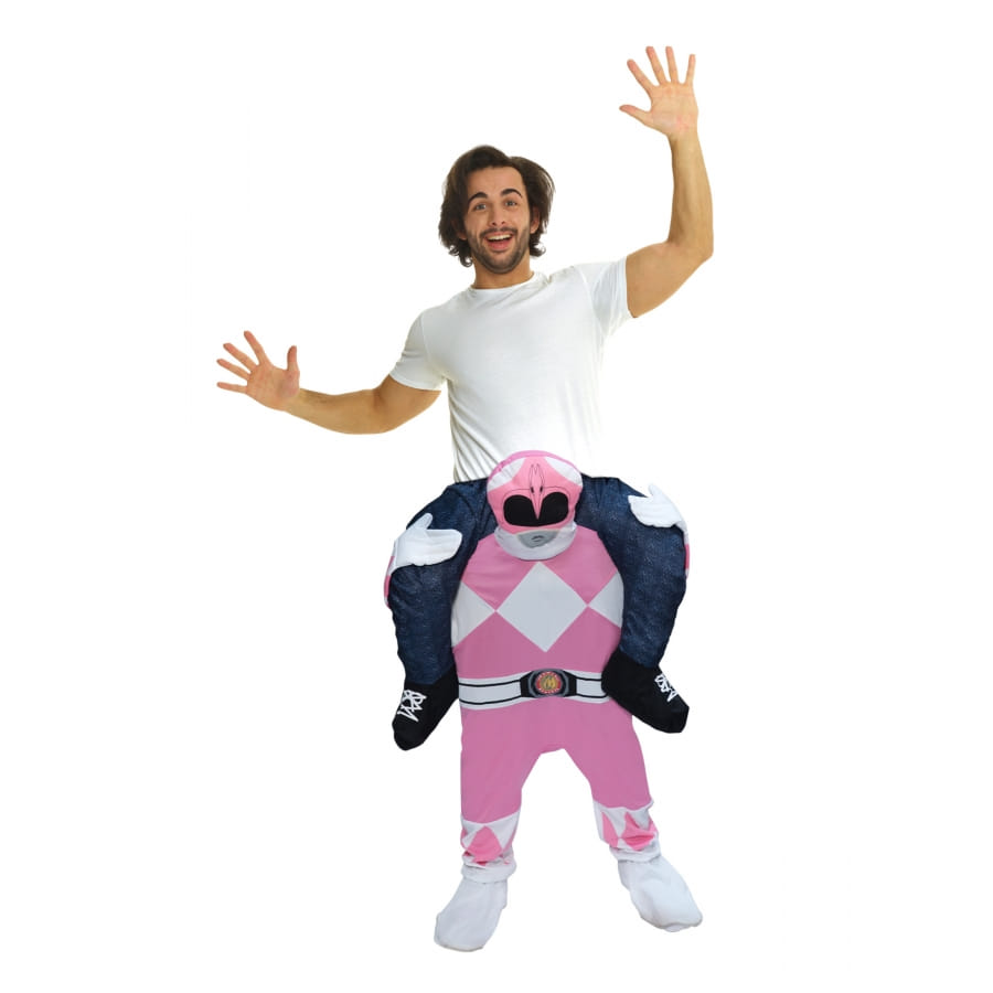 Ce costume sous licence officielle Morphsuit représente un homme sur les épaules du Power Ranger rose.