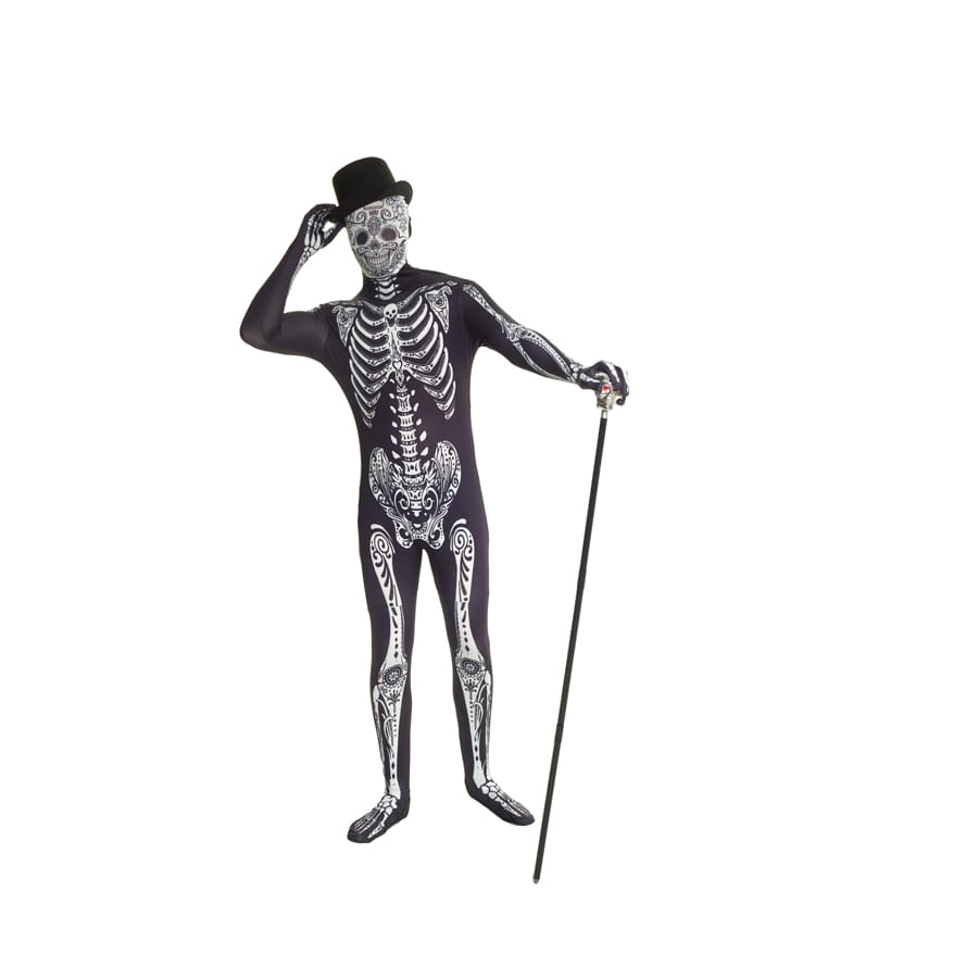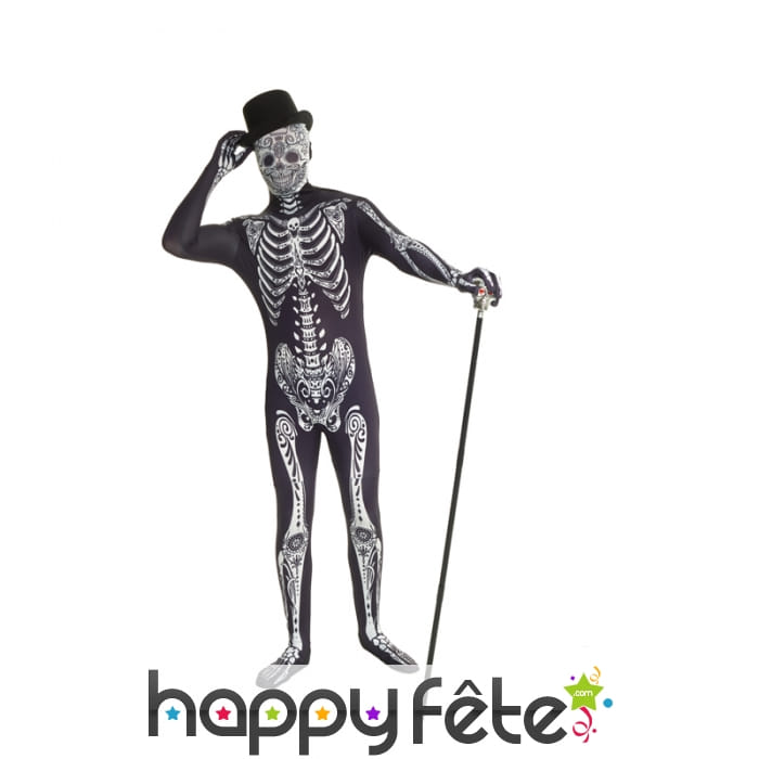 Le Morphsuit est l'une des dernières révolutions dans le monde du costume. Il se porte à même la peau dans des tons variés. Chez Happyfête, une déclinaison en squelette pourra faire votre bonheur messieurs. Le déguisement morphsuit pour adulte est une combinaison à cagoule qui se présente comme une seconde peau. Une impression de squelette sur l'intégralité du costume apporte une touche de frisson. Il n'a rien de bien sophistiqué pour ceux qui souhaitent se démarquer avec un seul article. La capuche incorporée est davantage frémissante, ce qui vous transformera en une toute autre personne. Rajoutez un modeste chapeau et une canne pour plus de sensations fortes.