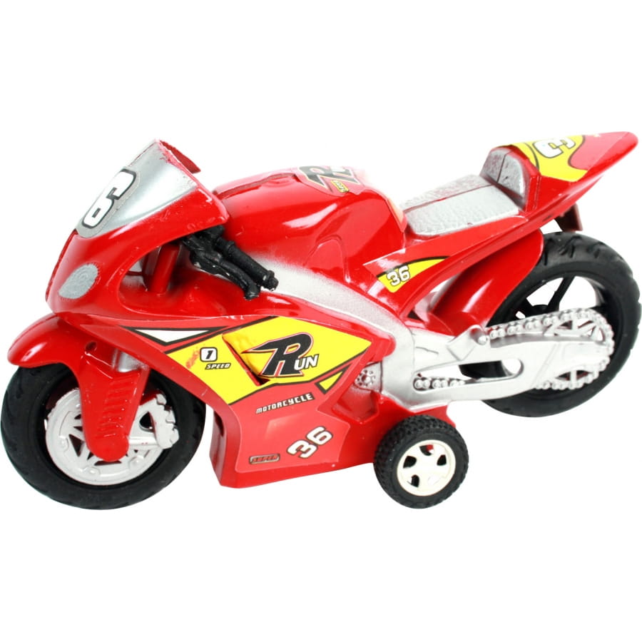 Motocross gris, jaune et rouge à rétro-friction mesurant 10 centimètres. Lors de la commande, vous ne pourrez choisir ni la couleur ni le modèle de la moto. Vous la recevrez comme présentée. Ce jouet est un cadeau idéal pour votre garçon.