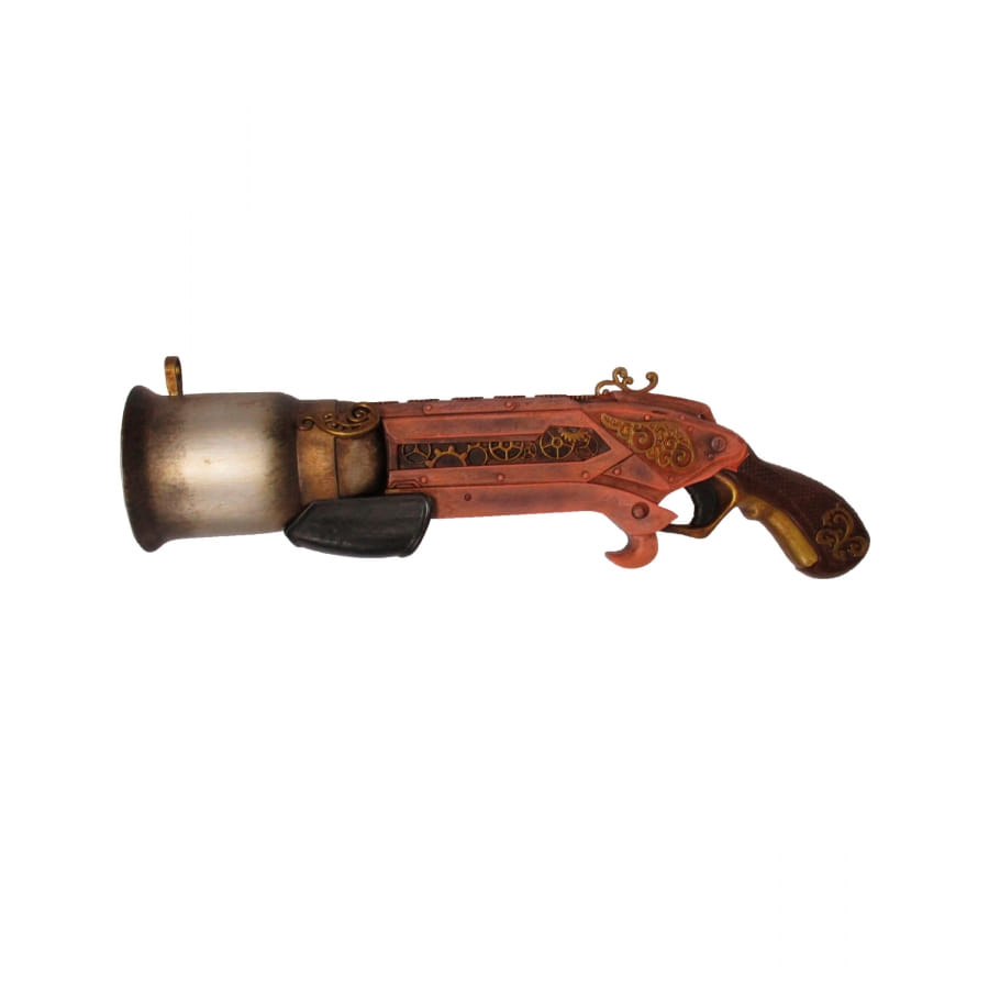 Des rouages dorés, typiques du style Steampunk, sont présents sur la crosse et agrémentent cette arme factice.