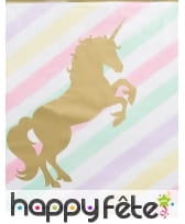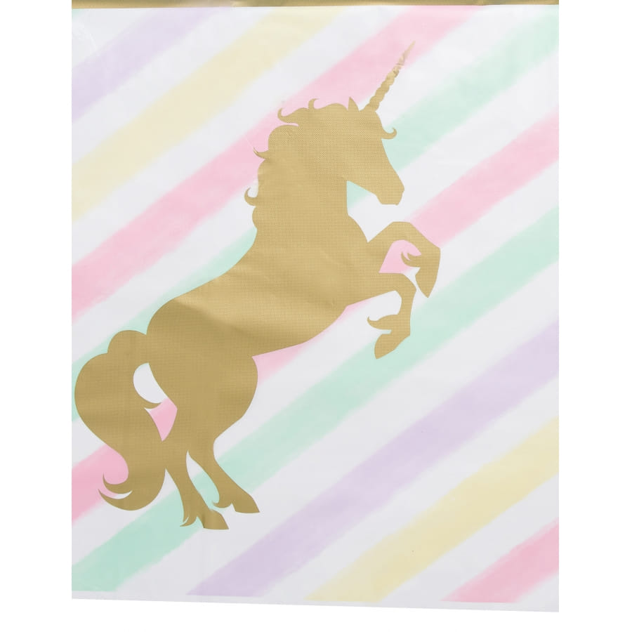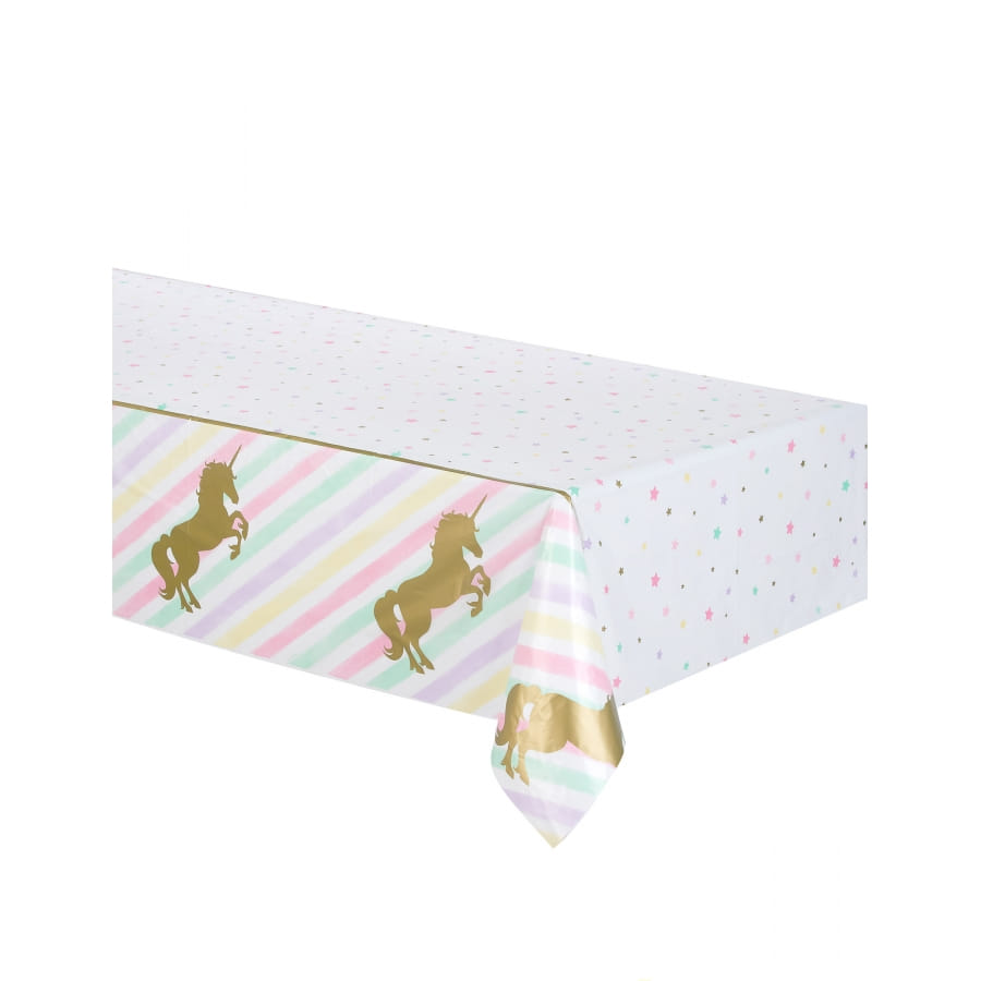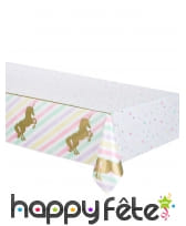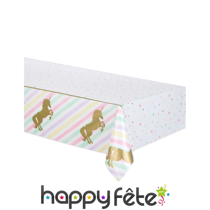 Cette nappe n'est pas une simple nappe. Elle est un voyage dans un monde où les licornes dorées se cabrent joyeusement sur les côtés, comme pour inviter vos invités dans une aventure enchantée. Et que dire de ces lignes obliques colorées en tons pastel ? Elles ajoutent une touche de douceur et de rêverie, créant une atmosphère à la fois paisible et joyeuse.