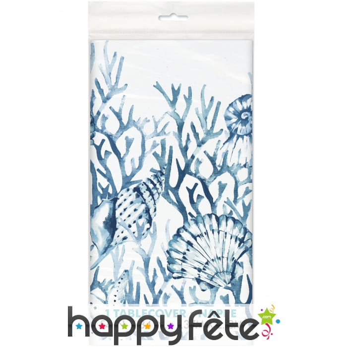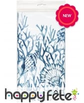 Partez autour du monde sans bouger de chez vous, grâce à la nappe blanche imprimé corail et coquillages bleu.