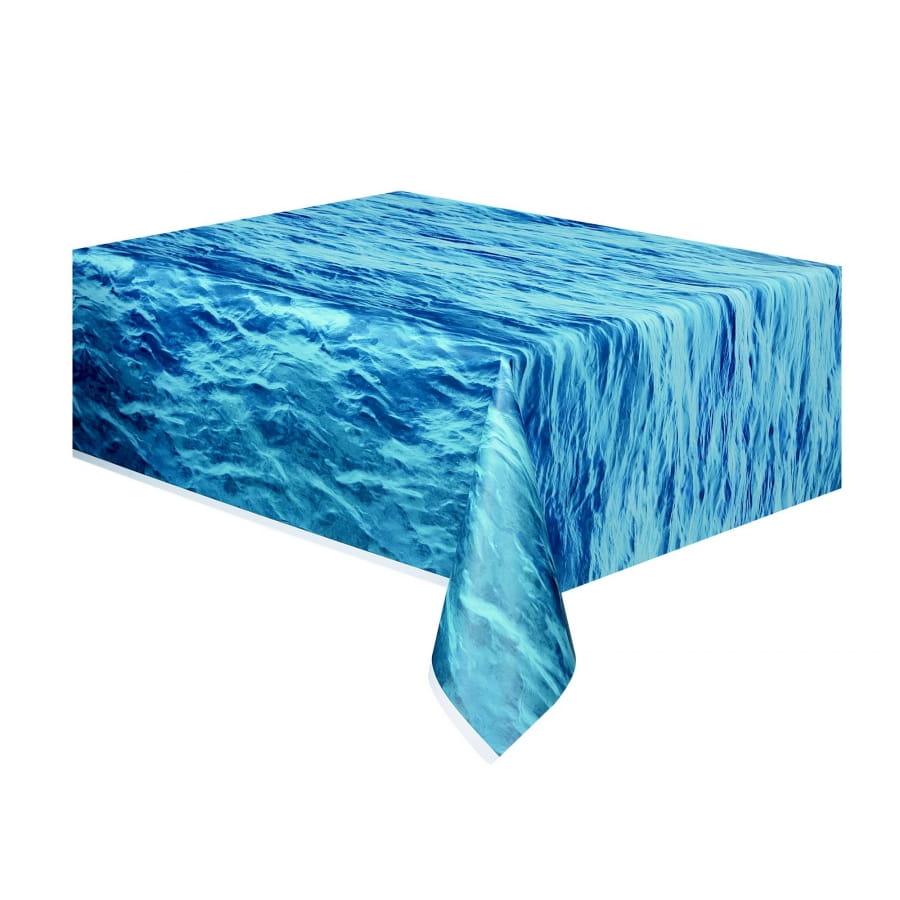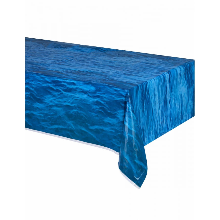 La nappe bleue motif océan de 137 x 274 cm est en plastique.