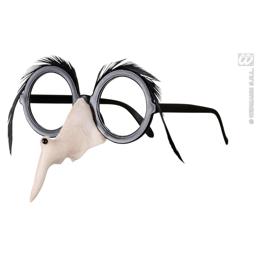 Paire de lunettes rondes de couleur noire attachée à un nez de sorcière avec verrue et sourcils à plumes. Déguisez-vous en méchante sorcière et concoctez une potion à l'occasion d'Halloween!
