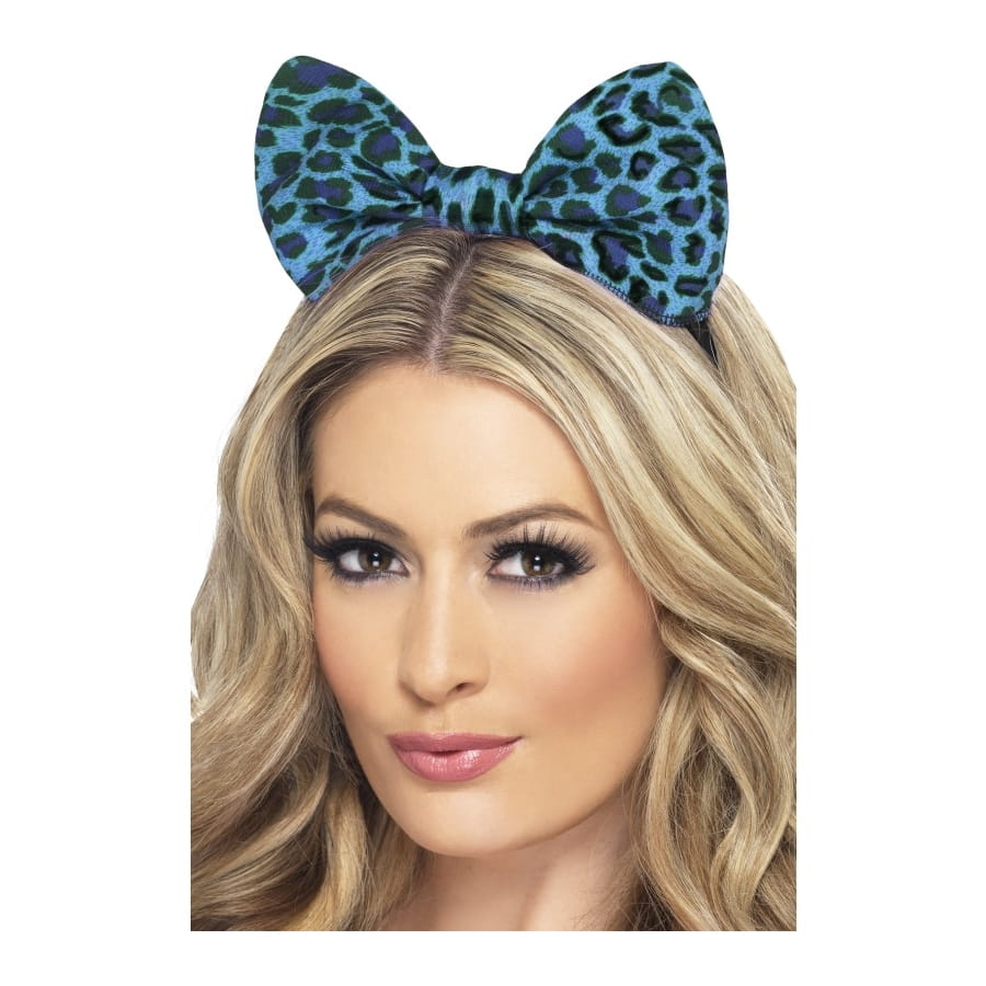 Serre-tête monté d'un noeud papillon pour cheveux, imprimé de motifs léopard bleus et noirs, pour femme, adolescente ou fille. Cet accessoire ajoutera une touche originale à votre déguisement.