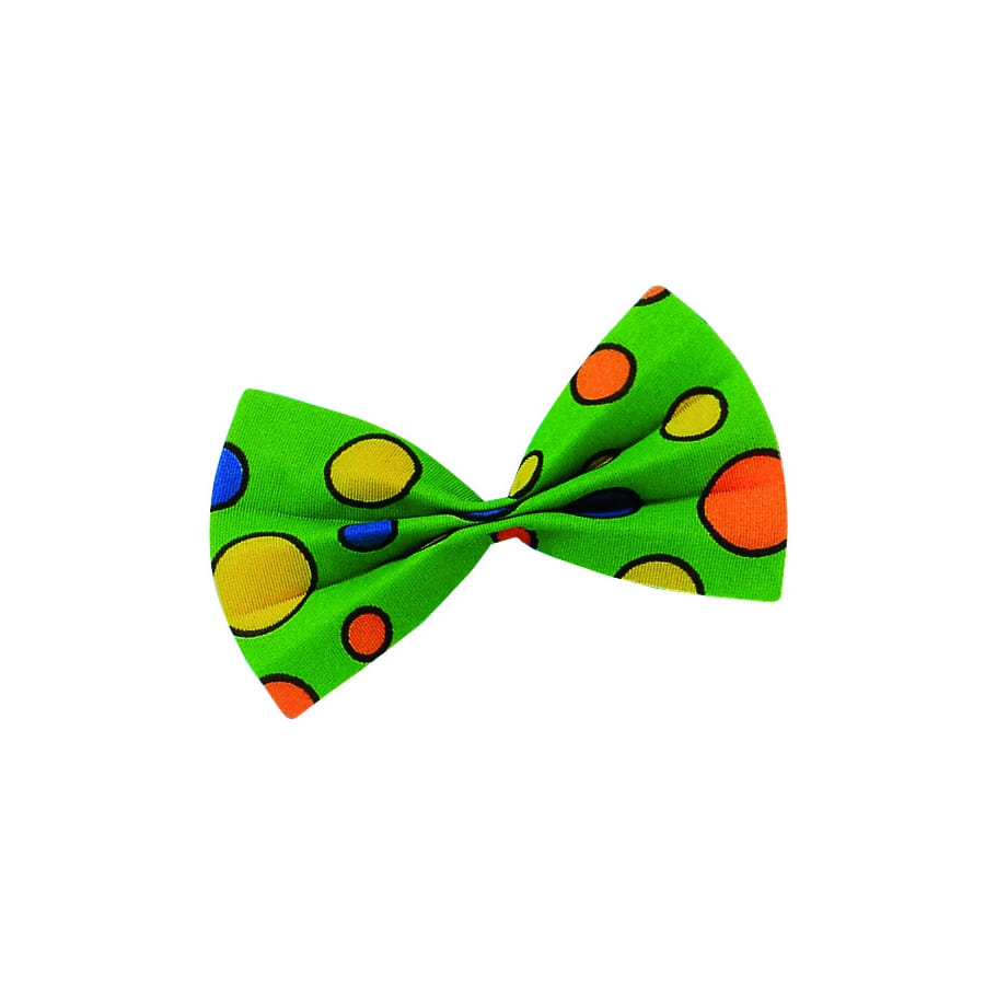 Noeud papillon de clown vert fluo à pois multicolores. Cet accessoire mesure 13 centimètres sur 8.5 centimètres. Il est idéal pour vous déguiser en clown pour un carnaval ur le thème du cirque.