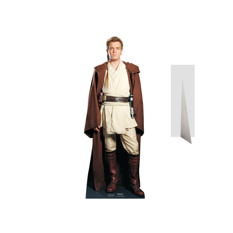 Les personnages de Star Wars sont de la fête, même juste pour décorer, avec par exemple cette silhouette d'Obi Wan Kenobi de taille réelle en carton que vous voyez ici et qui est sous licence Star Wars. Elle est en carton, de 176 cm de hauteur et 66 cm de largeur. Vous y verrez Obi Wan Kenobi par Ewan McGregor avec un manteau marron, des bottes marrons et un genre de kimono blanc.
