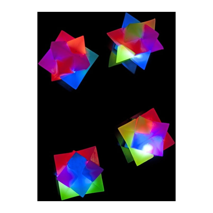Balles géométriques multicolores, lumineuses et clignotantes, vendues en lot de 12. Ces petites balles ont des formes singulières et intriguantes qui les rendront idéales comme accessoire de décoration.