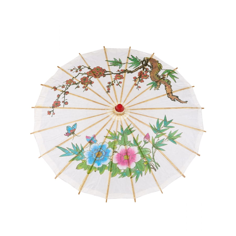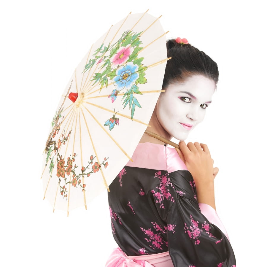 Complétez un costume de geisha asiatique à l'aide de notre ombrelle chinoise blanche avec imprimé coloré.