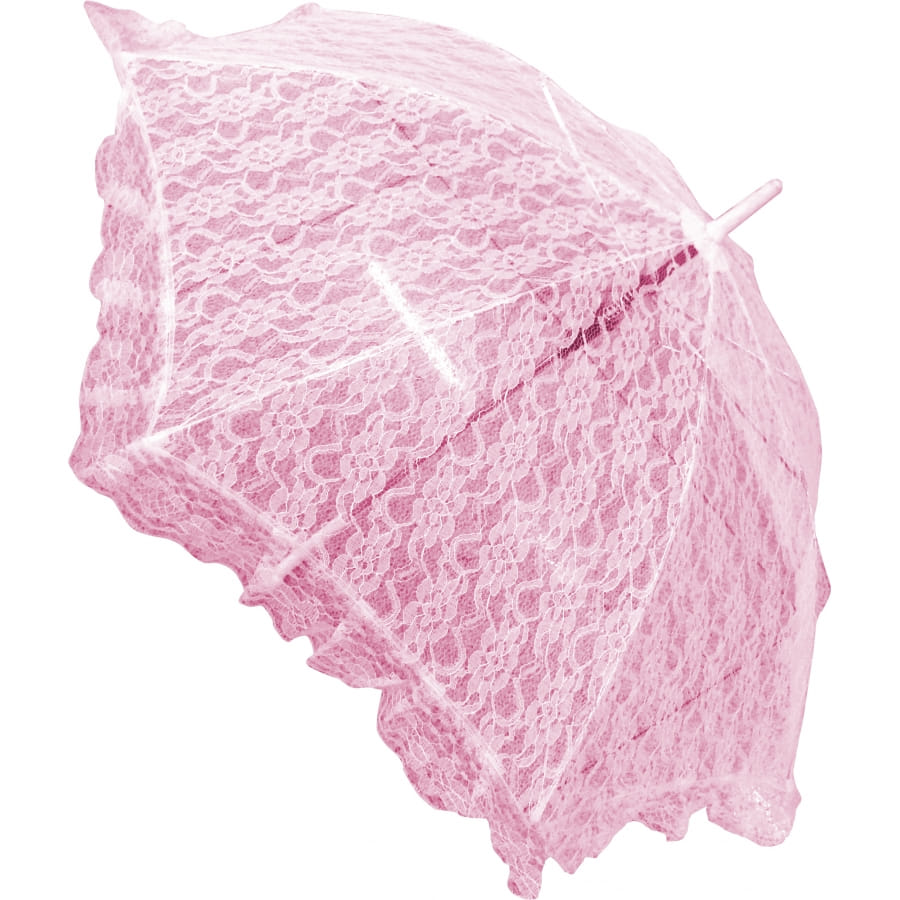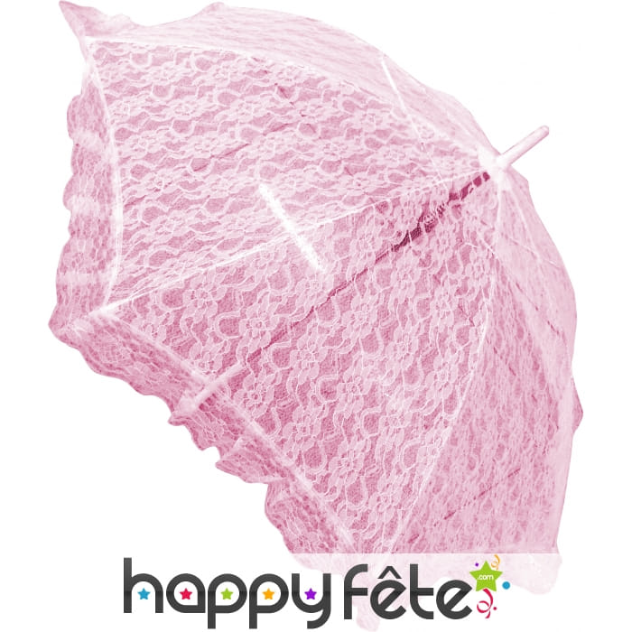 Ombrelle de princesse rose entièrement décorée de dentelle. Cette ombrelle mesure 69cm de diamètre. C'est un accessoire idéal pour une fête sur le thème de conte de fée ou de mariage.