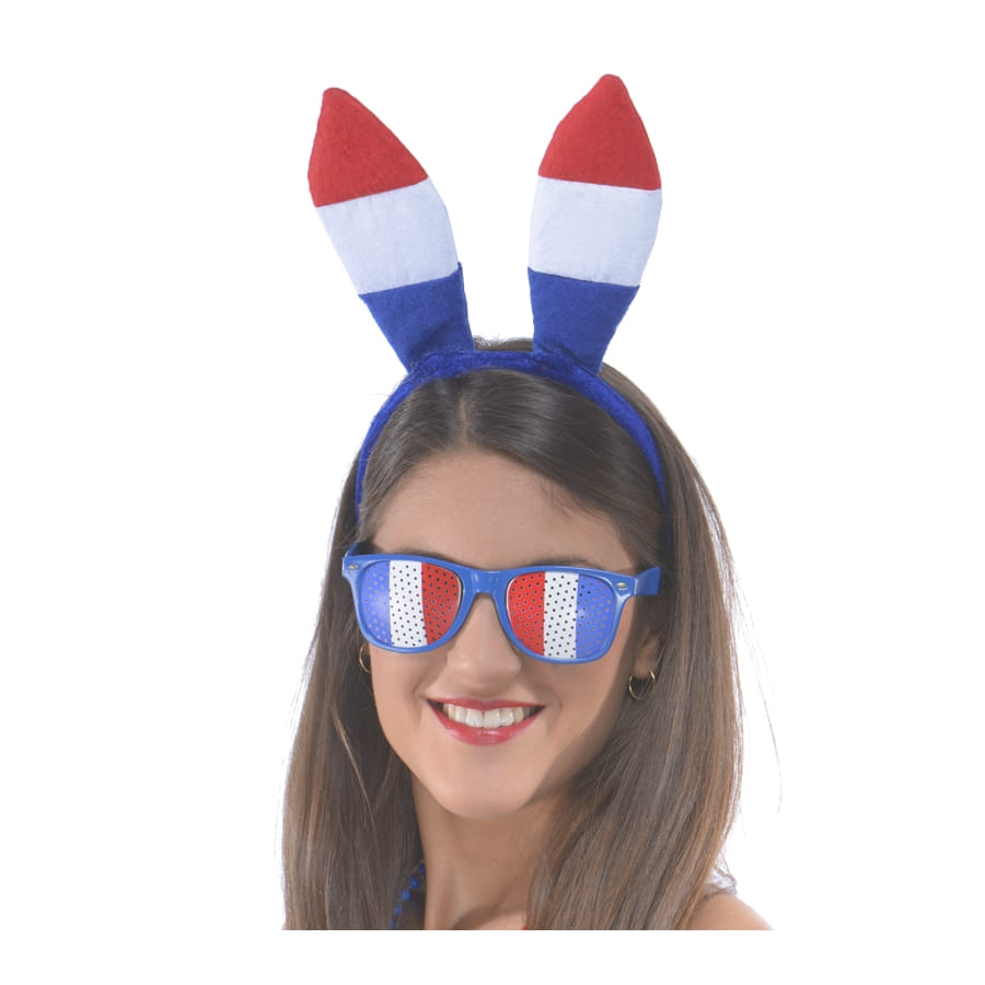 Exprimez votre soutien à l'équipe de France de manière amusante lors d'un match de football ou pendant la coupe du monde en optant pour ces oreilles de lapin tricolores bleu blanc rouge aux couleurs de la France. Cet accessoire de déguisement de supporter pour homme ou femme sera également parfait lors d'un carnaval. Vous pouvez aussi les mettre à l'occasion de la fête nationale. Lunettes et applaudisseur bleu blanc rouge sont aussi disponibles sur le site.