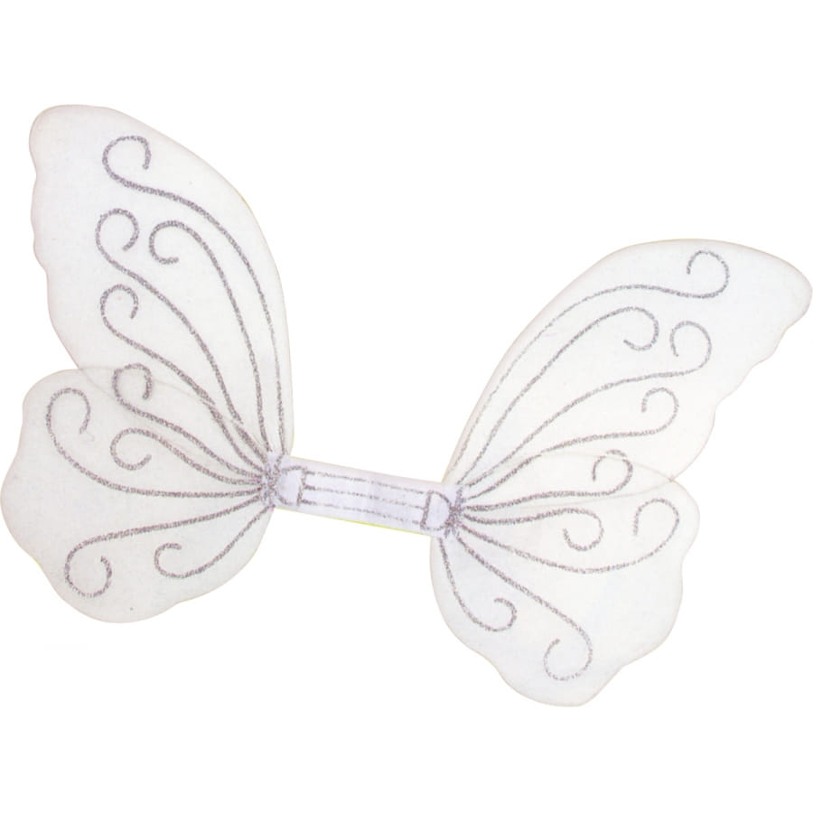 Paire d'ailes de papillon pour femme. Les ailes sont blanches et agrémentées de paillettes. Elles mesurent 50 centimètres de large. Vous ne pourrez choisir ni le modèle ni la couleur lors de la commande. La paire d'ailes viendra sera envoyée comme présentée ici en photo.