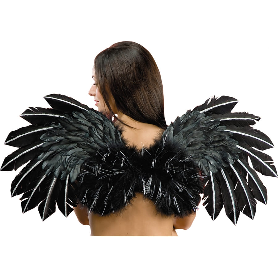 Paire d'ailes en plumes noires agrémentées de paillettes pour femme. Les ailes mesurent 40 centimètres de hauteur et 80 centimètres de largeur. La texture des ailes est très soyeuse, les rendant agréable à porter. Cet accessoire de déguisement est idéal pour les carnavals sur le thème de l'ange noir.