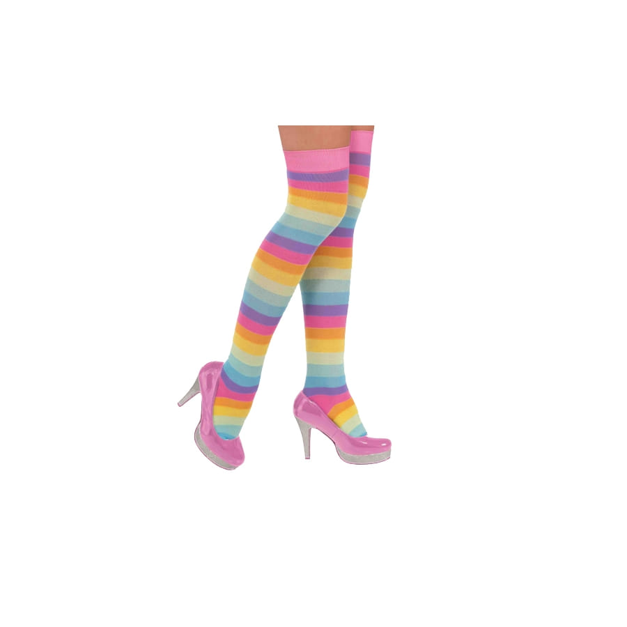 Voilà une idée géniale pour se transformer en clown : une paire de bas de clown rayés pastels, un accessoire féminin aux rayures multicolores pour un déguisement réussi et sensationnel. A l'occasion d'un carnaval, d'un spectacle pour enfants ou d'un goûter d'anniversaire, vous serez en mesure de ravir tous les enfants avec toutes ces couleurs qui seront sur vous, en complément de votre humour et de votre talent bien sûr !