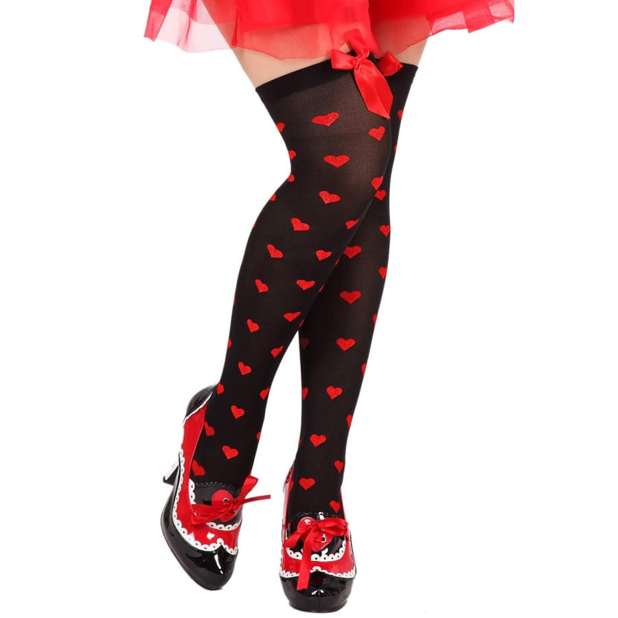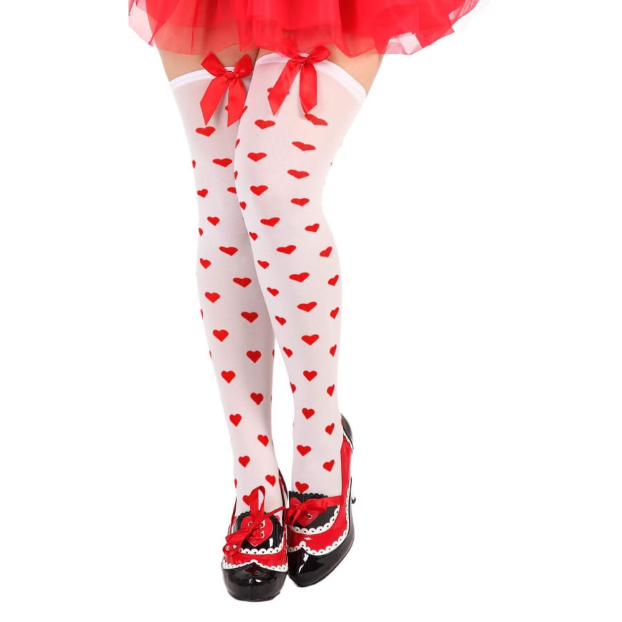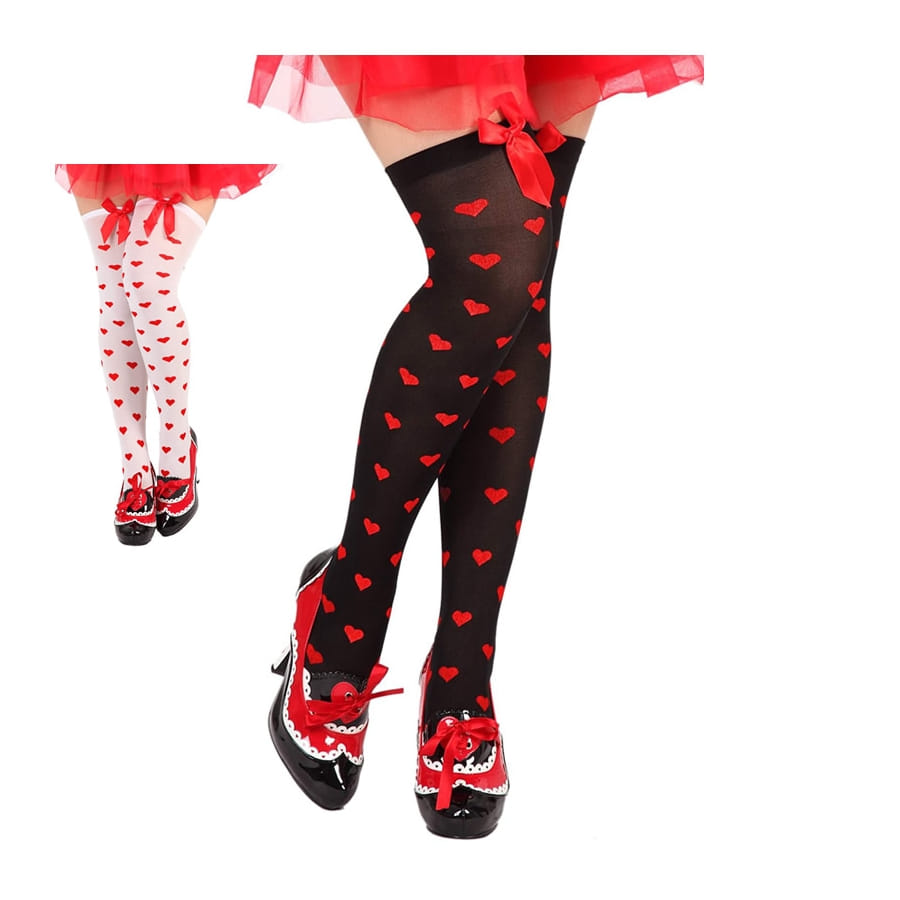 Quand les coeurs apparaissent un peu partout, vous aurez deviné que l'amour est dans l'air ! Cette paire de bas décorés de petits coeurs rouges est tout à fait appropriée pour la Saint-Valentin. Les bas sont longs et remontent jusqu'à mi-cuisses. De couleur noire ou blanche, ils sont décorés de motifs petits coeurs rouges accompagnés d'un petit noeud rouge satiné sur chaque bas.