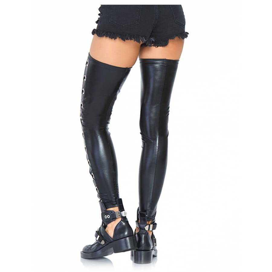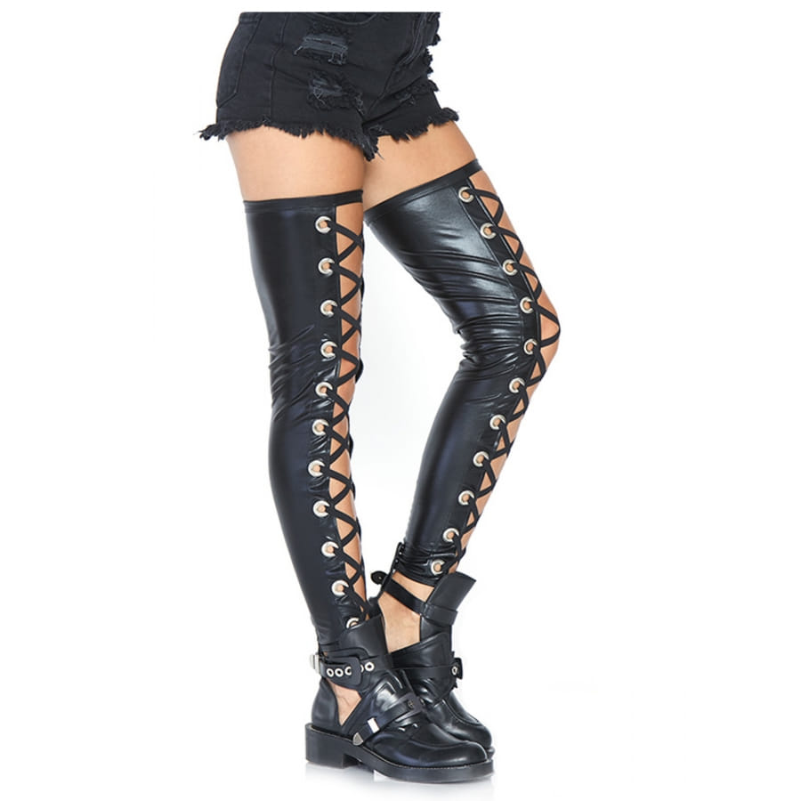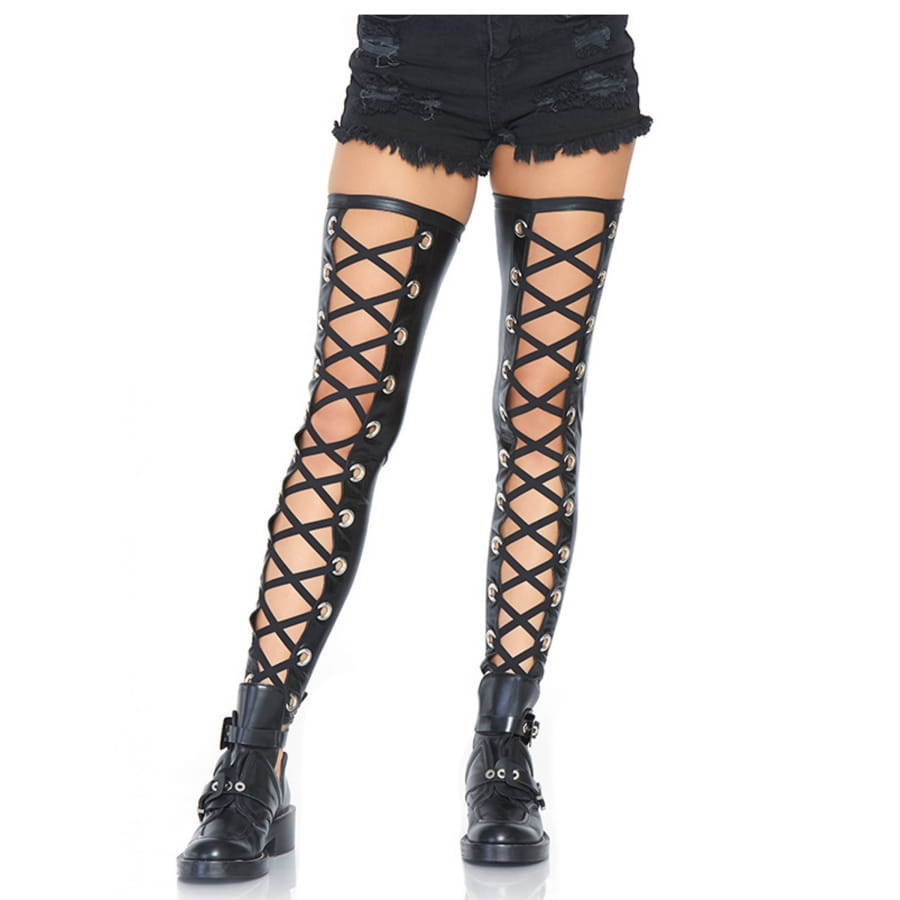 La paire de bas noirs sans pieds avec laçage pour adulte est conçue particulièrement pour les femmes.