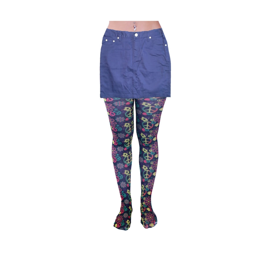 Proposés en une seule taille, les bas sont parsemés de motifs floraux et de symboles peace and love de toutes les couleurs.