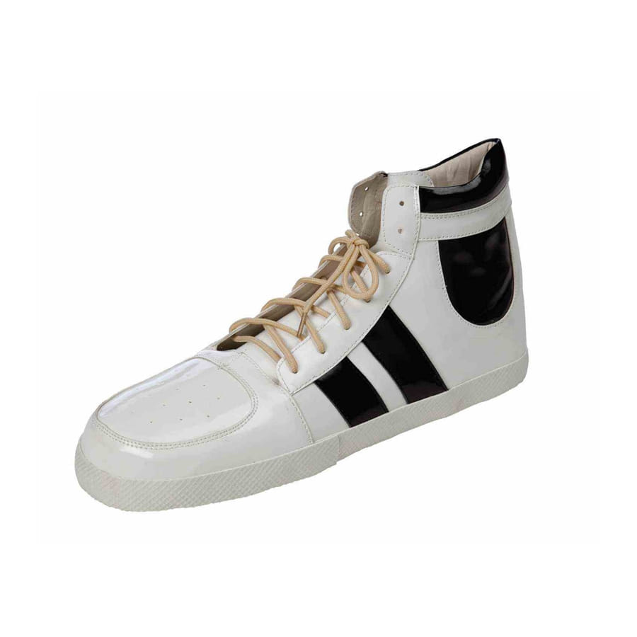 Vos pieds ne passeront pas inaperçus avec cette paire de basket Sneakers géante. Celles-ci sont montantes, adoptant un style urbain "hip-hop". Elles sont en plastique, à base blanche avec des bandes noires et un laçage beige. Chaque basket mesure environ 32 cm de long. Cet accessoire conviendra aussi bien aux femmes qu'aux hommes.