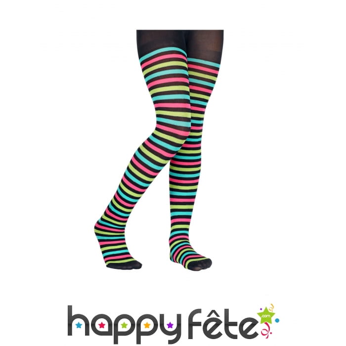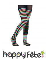 Les collants sont dotés de rayures multicolores imprimées sur un fond noir.