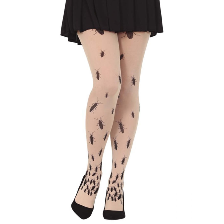 Cette paire de collants au design unique présent un tissu léger recouvert de motifs noirs en forme de cafards.