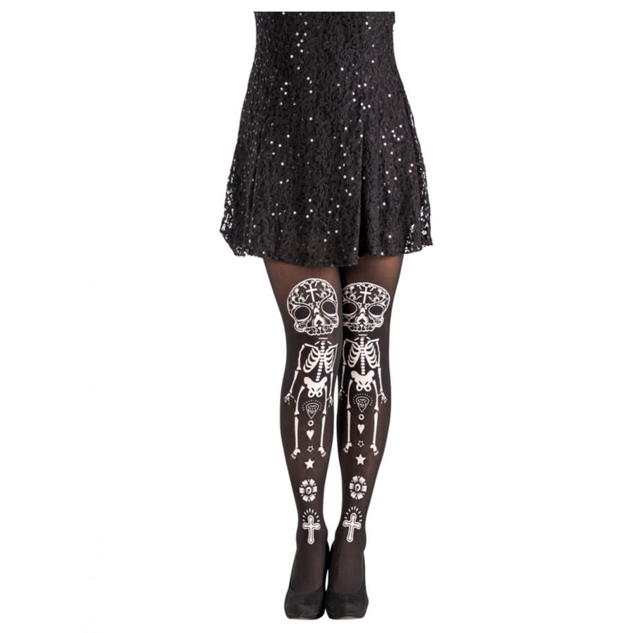 De couleur noir, ces collants sont imprimés en blanc sur les jambes d'un squelette, d'une fleur et d'une croix.