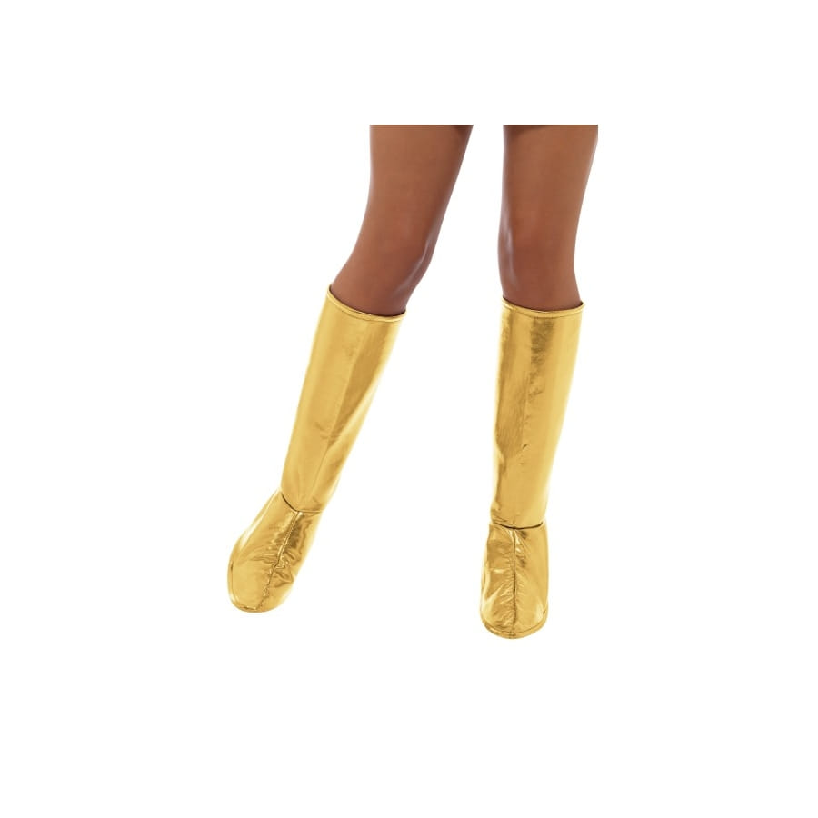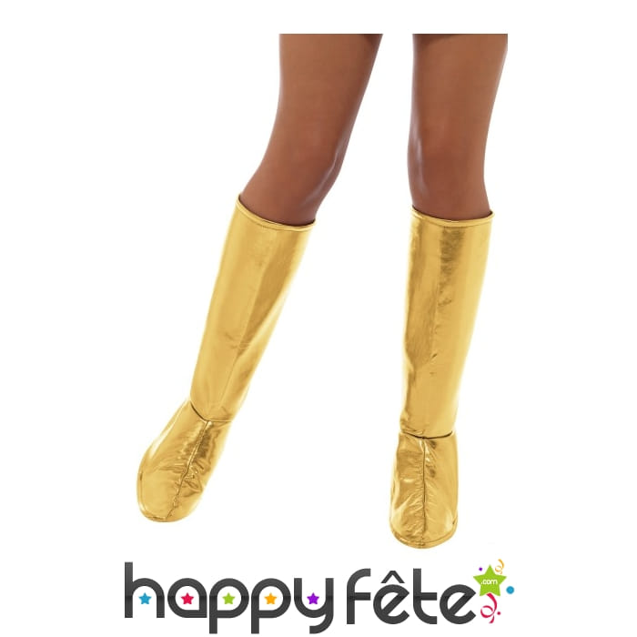 La meilleure façon de compléter sa tenue rétro est d'y ajouter une touche de brillant ou de paillettes. Cette paire de couvres bottes dorées va faire des jalouses ! De couleur or et bronze, elles couvrent entièrement les jambes. Elles sont un peu tape-à-l'oeil avec leur aspect qui brille de mille éclats, à combiner idéalement avec un mini short ou une robe hippie.